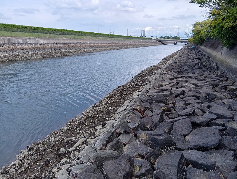 大潮ど干潮の1時過ぎからこんな場所で開始、竿6.1m道糸0.8号1号の中通し錘にハゼ針7号エサは青虫。