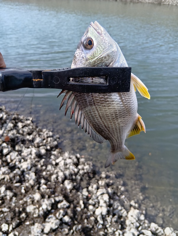 やっとのことで針掛かりさせた第1号、大きさは14cmほどあり水深も3mぐらいから上がってくるのでめちゃ楽しい。