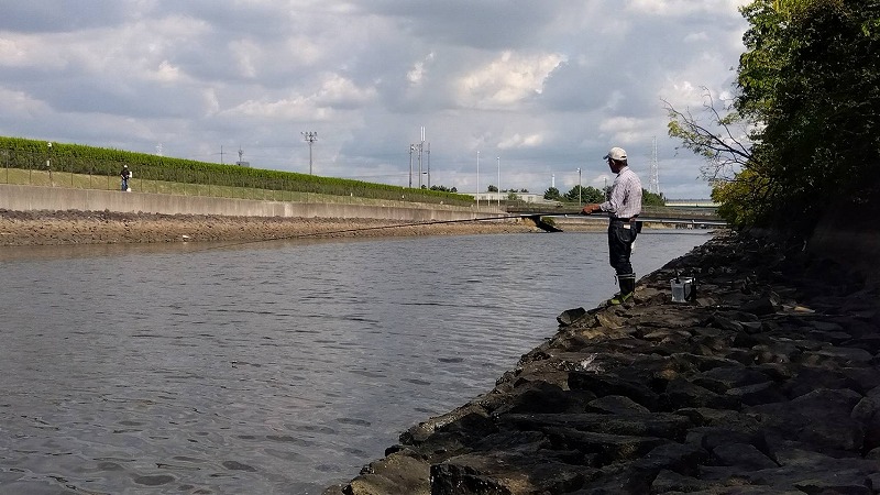 足元の堤防の影の明暗部を釣るために1mぐらいバックして立ち位置をとる。
