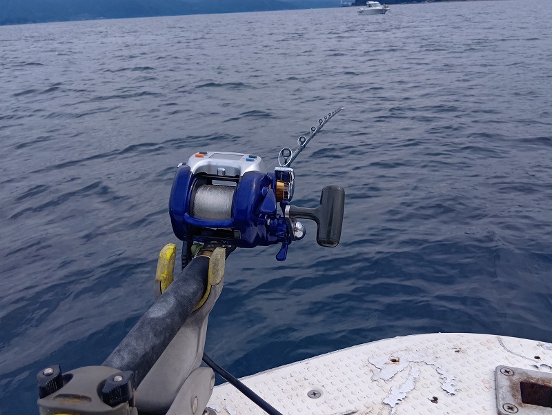 慌ててドラグをもっと締め込み巻こうとするが電動リールはうなるだけで巻けない、本人大パニック。