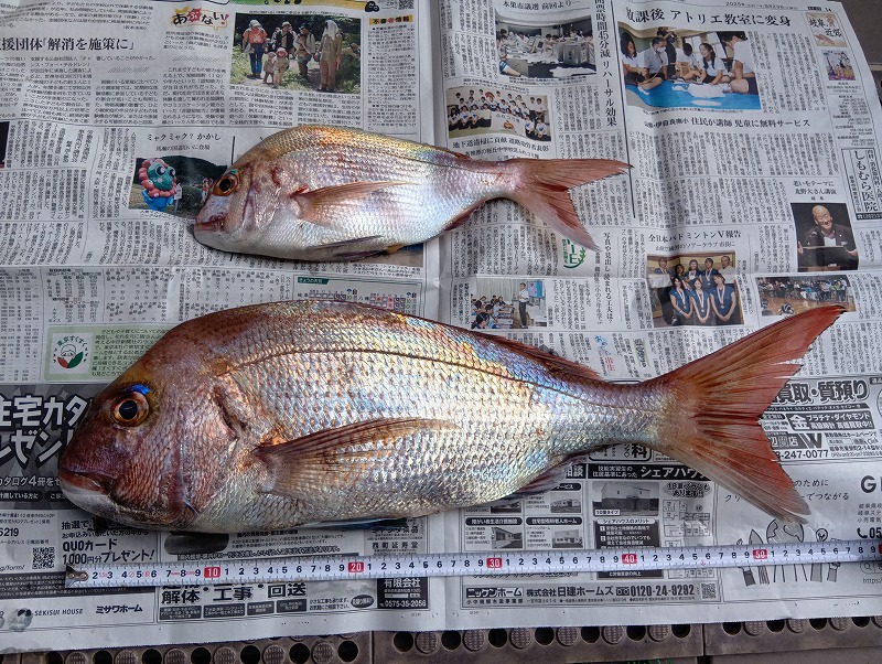 今日初めてのそれも大物の当たりを外してしまってがっくりしていると、隣で海釣り師匠がまたもや60mで40オーバーの真鯛ゲット。