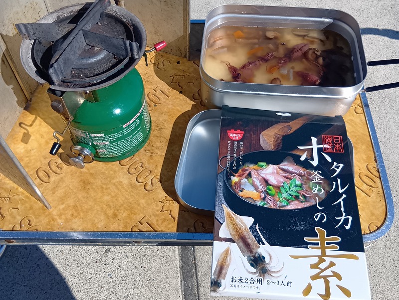 昼ご飯はこれまた時間つぶしに富山土産でもらったホタルイカ釜飯の素を作ってみる。