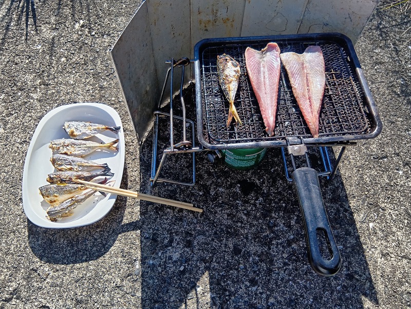 昨夜釣ったアジとともに塩焼き、はらんぼとはカツオの大トロの部分。
