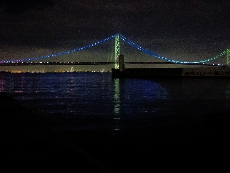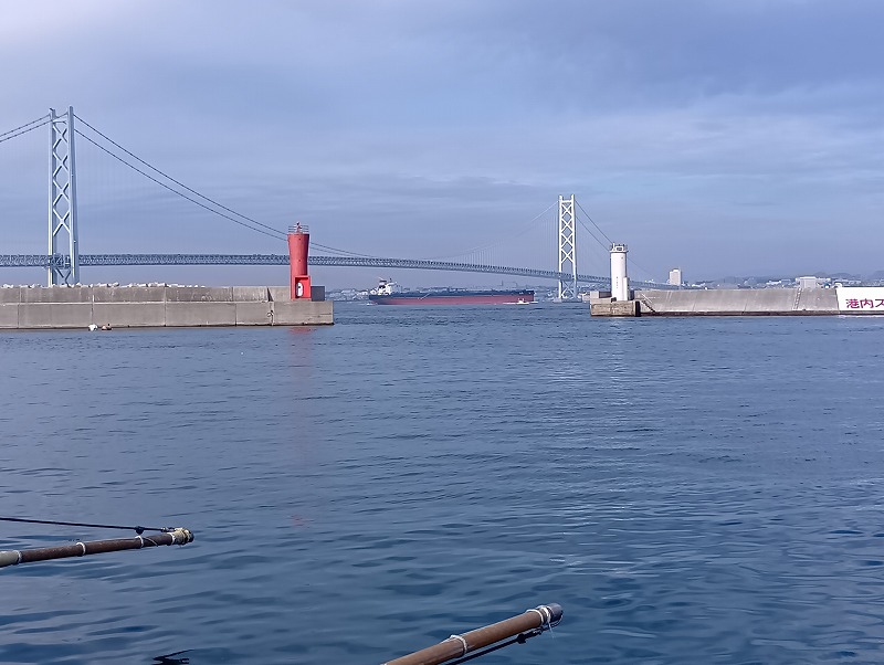 沖側を見れ明石大橋、遠近感の錯覚で貨物船が橋梁に引っ掛かりそうでヒヤヒヤドキドキでした。