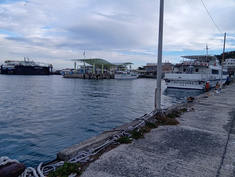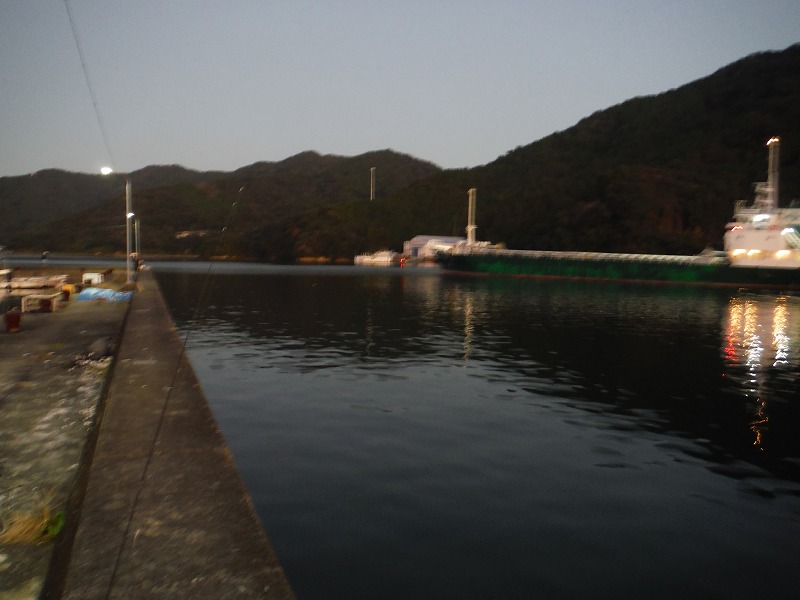 サイズ狙いで須崎漁港へ明るいうちからエントリー、湾奥に工場もあり漁船よりもでかい船の航路わきで釣れる雰囲気プンプン。