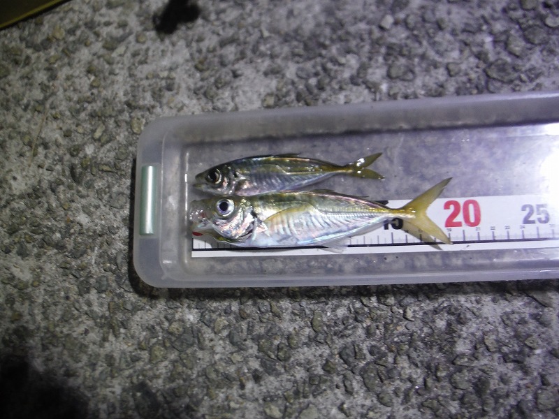 釣れてくるアジは15cm以下のスリム体形だったが港の角の夜光虫が吹き溜まっていた下で1匹だけ良形ゲット。