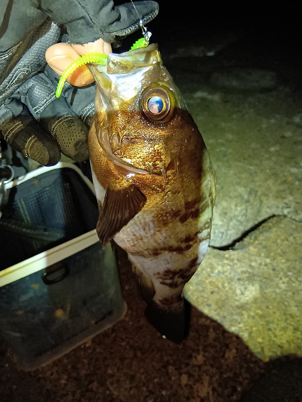 重量感を感じる割には暴力的な引きが無い?初物だから慎重に寄せてきて堤防へ抜き上げると良形メバル。