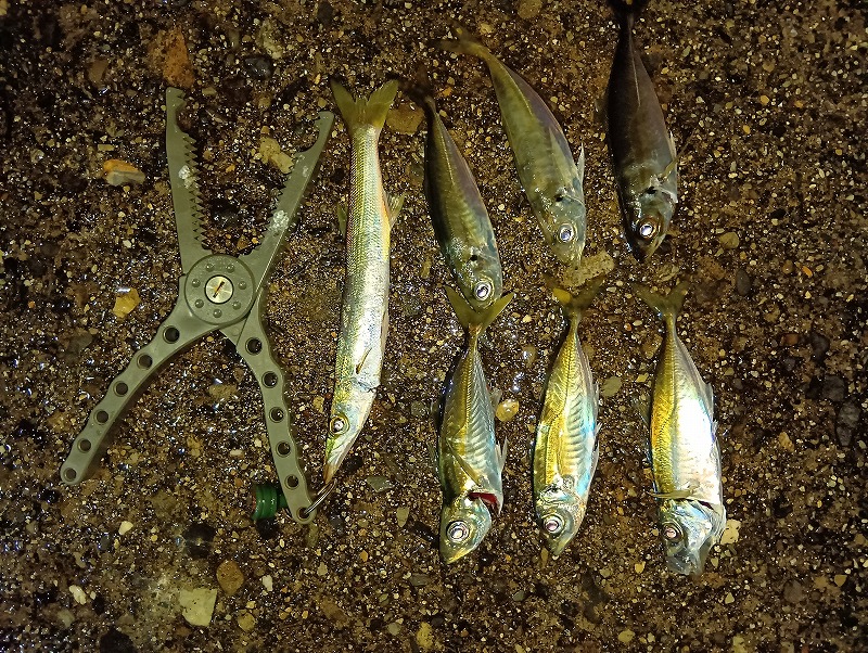 落ちていく途中で今までよりはっきりわかる当たり、引きもちょっと良し良形を期待して取り込んだら鉛筆カマスでした。(笑)
