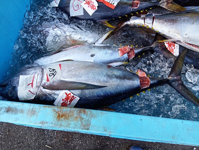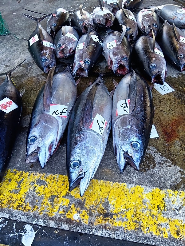 これは丸々としたメバチマグロ、脂の乗りを確認するために尾びれの付け根を切り開いてあった。